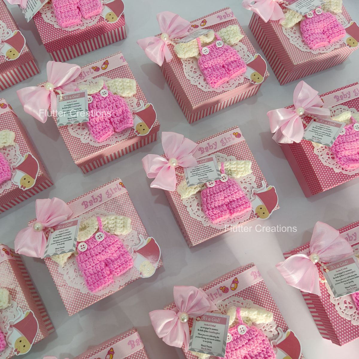 Celebrate the arrival of a baby girl with this exquisitely crafted announcement box. Featuring a delicate crochet dress beneath a charming doily, it is adorned with a pink polka dot pattern and a printed baby girl ribbon. The top is finished with a sophisticated double ribbon bow, combining texture and elegance to create a premium presentation perfect for welcoming your little one.