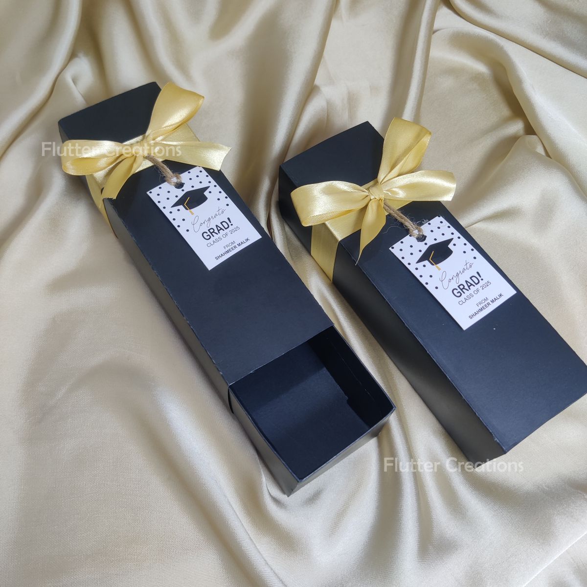 Celebrate your graduation in style with our Long Form Graduation Box, thoughtfully designed to hold your chosen keepsakes and gifts. Featuring a sleek ribbon and a customizable tag, this elegant packaging adds a personal touch to your celebration, making it perfect for sharing memorable moments with friends and family.
